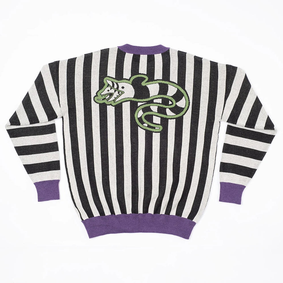 Dive into the eccentric world of Beetlejuice with our 2024 Sandworm Knit Holiday Sweater! Adorned with the iconic "Beetlejuice, Beetlejuice Beetlejuice, on the front and a whimsical sandworm graphic on the back, this cozy sweater is the perfect way to showcase your love for the cult classic while staying warm during the holiday season. Whether you're attending a spooky holiday party or just enjoying a movie marathon, this fun and festive piece will keep you stylishly haunted!
